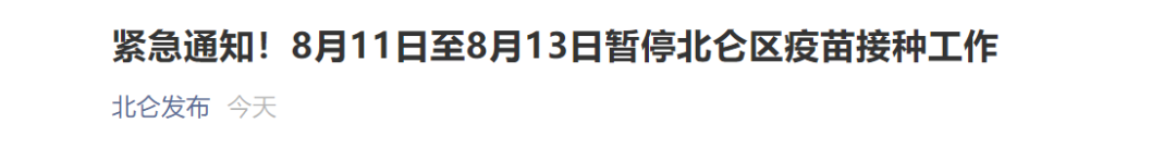 01 多地发布暂停新冠疫苗接种通知 近日,多地发布暂停新冠疫苗接种的通知。据国家卫健委官网消息,截至2021年8月10日,31个省(自治区、直辖市)和新疆生产建设兵团累计报告接种新冠病毒疫苗180809.2万剂次。 浙江省宁波市北仑区 今日,“北仑发布”微信公众号发布通知,宁波发布了宁波舟山港作业人员例行核酸检测中1例新冠病毒核酸检测阳性人员,为严防人员聚集,阻断病毒传播,确保人民群众生命健康安全。经北仑区新冠疫情防控工作领导小组办公室决定,2021年8月11日至8月13日暂停北仑区新冠疫苗接种工作三天(含固定接种门诊、临时接种点、流动接种队等)。
