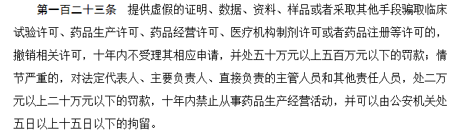 第一,许可准入处罚:按照《药品管理法》第一百二十三条给予处罚(以下图片为处罚条例,下同),将其相关责任人纳入黑名单并通报有关部门进行联合信用惩戒。